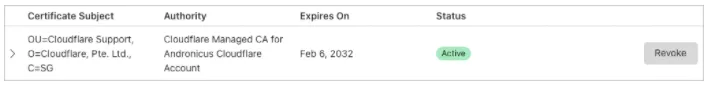 The following image displays an example of how a certificate with with Country Name, Organization Name, and Organizational Unit Name will look like on the Cloudflare dashboard: